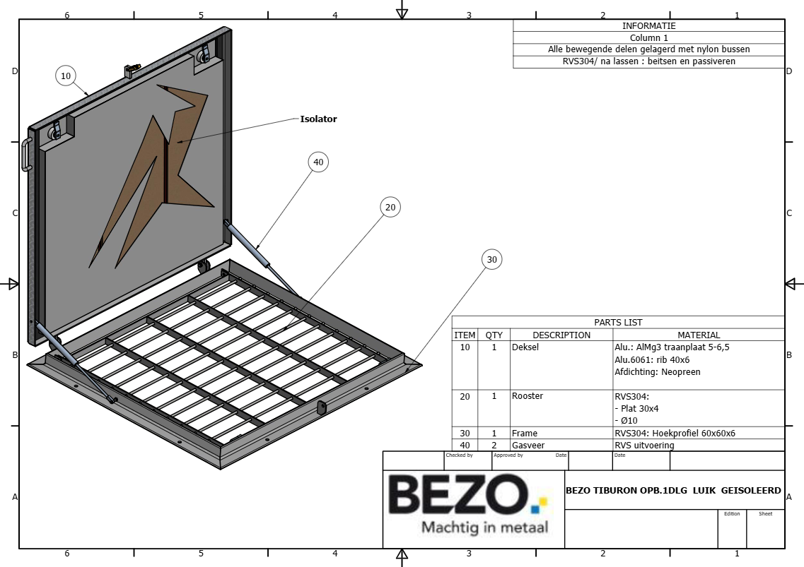RVS opbouwrand en aluminium tranenplaat deksel met een RVS veiligheidsrooster. Gasdicht d.m.v. neopreen afdichting. Alle bewegende delen zijn gelagerd met nylon bussen. Verder voorzien van een hangslot voorziening, RVS gasveer+ knevelslot. Geleverd incl montage materiaal bestaande uit: neoprene band voor tussen luik en dek/RVS bouten ringen+messing pluggen.