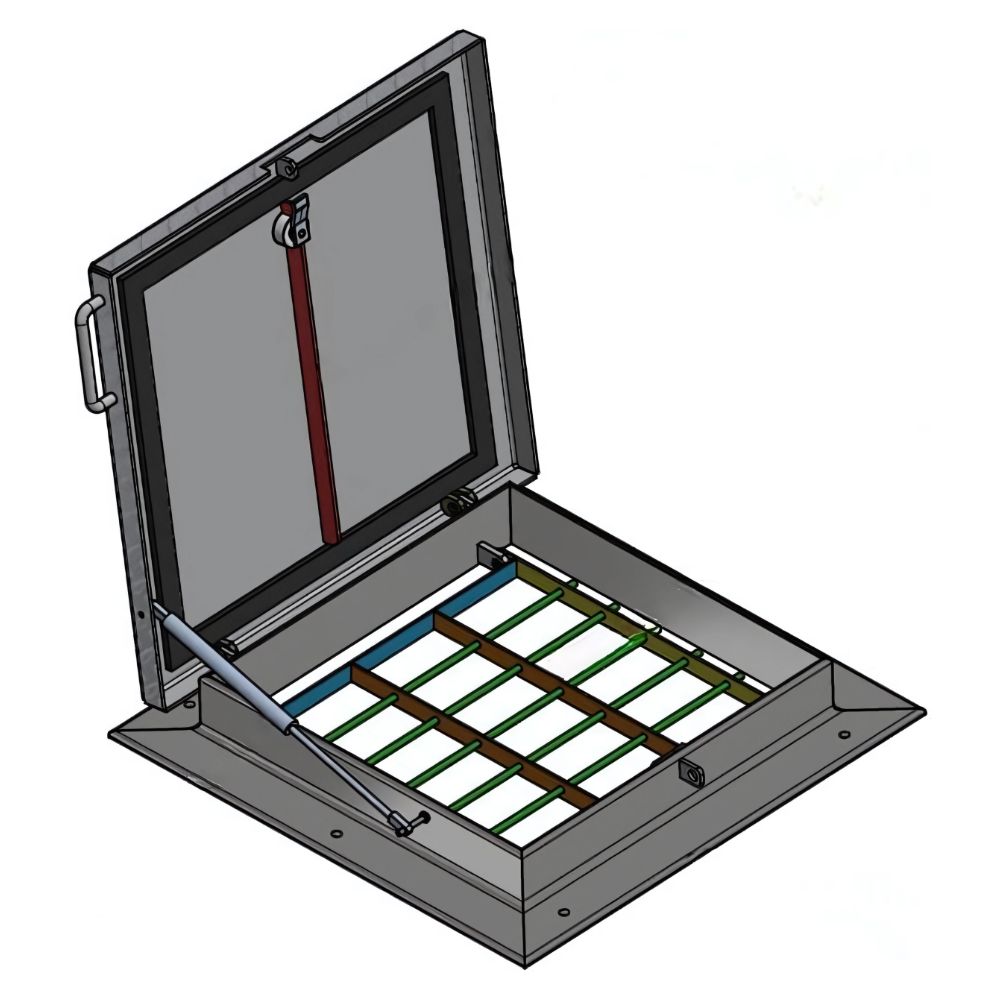 Dit eendelige opbouwluik heeft een aluminium opbouwrand (⦝ 100x100x10) met verdekte scharnieren en montagegaten buiten het deksel. Afhankelijk van de dagmaat heeft het luik een of twee veiligheidsrooster van RVS 316 en een aluminium deksel met een of twee RVS gasveren. De deksel is vervaardigd uit ALMG3 5/6 mm dik tranenplaat en is versterkt met ribben. Hierdoor is de deksel geschikt voor een belasting van 1,5 kN/m². Alle bewegende delen zijn gelagerd met nylon bussen en de neopreen afdichting maakt het luik gasdicht. Het luik wordt geleverd inclusief hangslotvoorziening, knevelsloten, bevestigingsmateriaal en neoprene afdichtband.